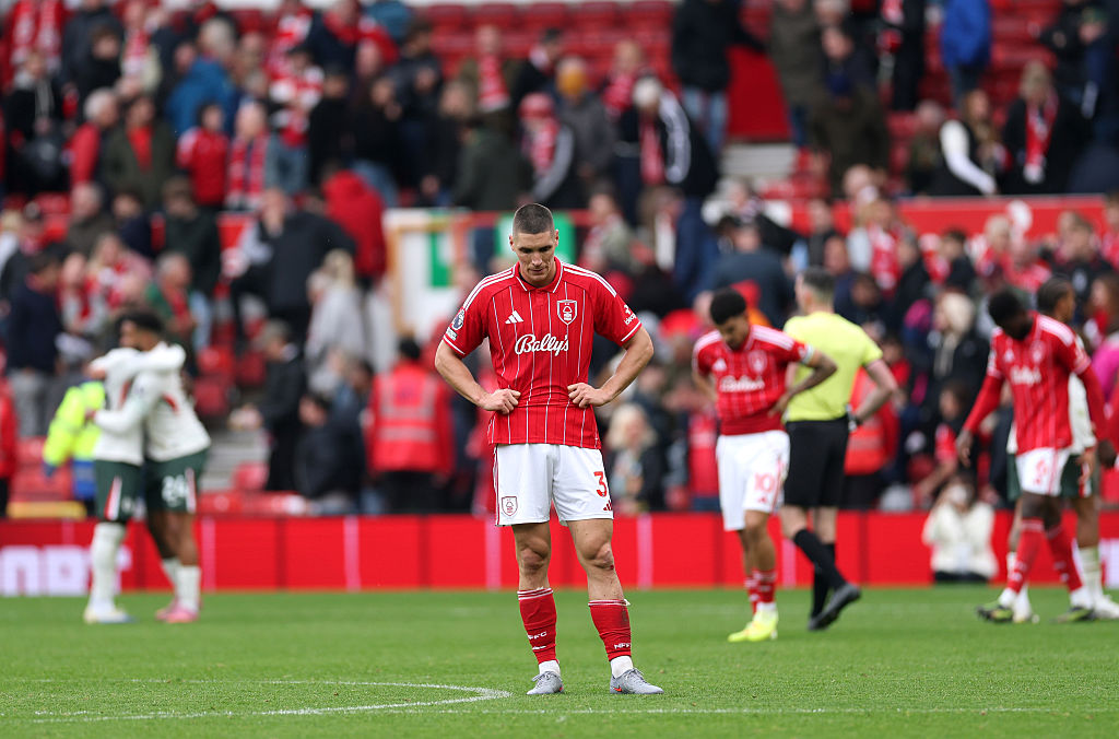| Image title: NOTTINGHAM, ENGLAND - OCTOBER 18: Nikola Milenkovic of Nottingham Forest looks dejected following the team's defeat during the Premier League match between Nottingham Forest and Chelsea at City Ground on October 18, 2025 in Nottingham, England. (Photo by Michael Regan/Getty Images) |