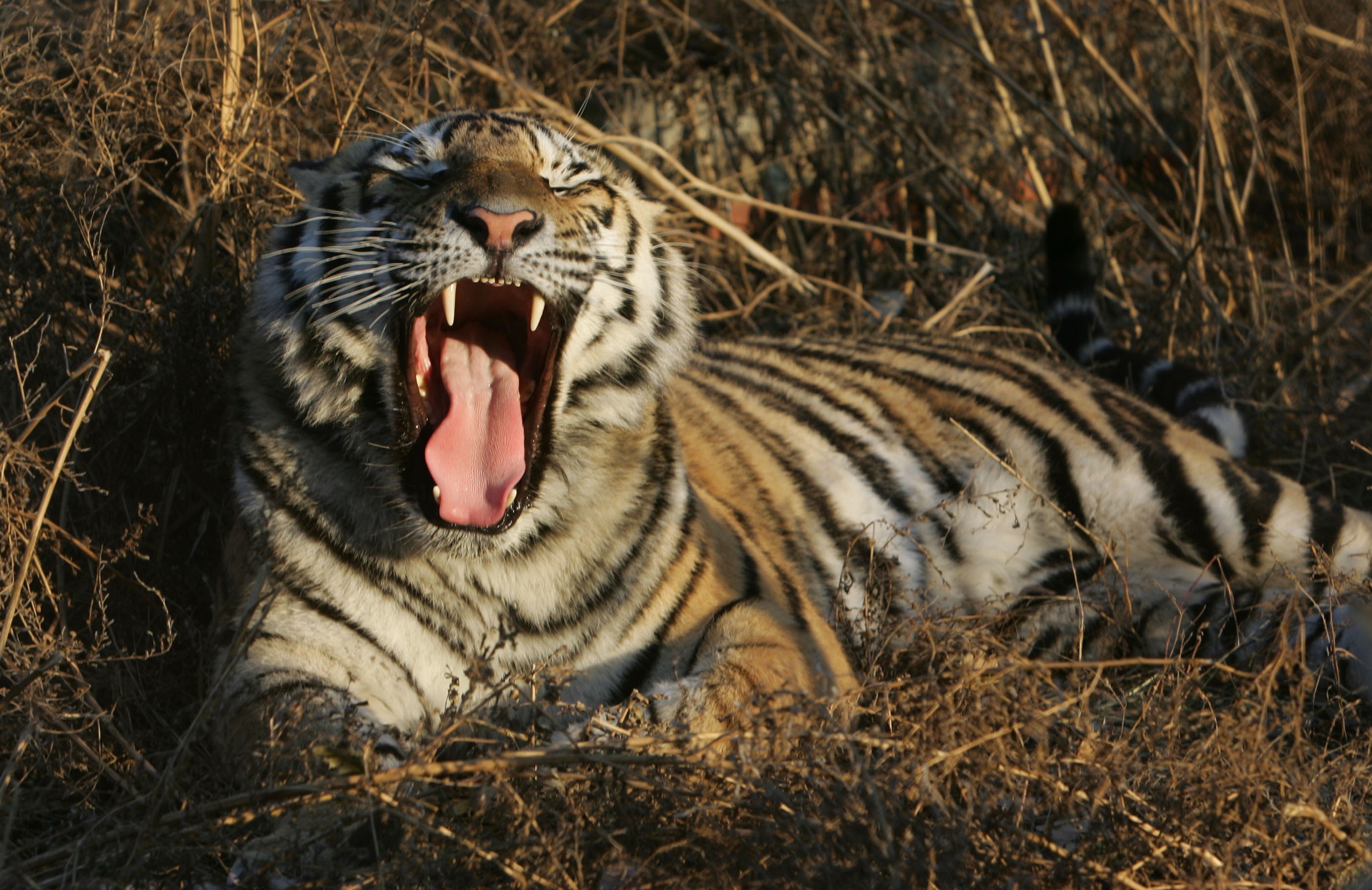 | Image title: HARBIN, CHINA - OCTOBER 25: (CHINA OUT) A Siberian tiger yawns in the Hengdaohezi Breeding Center for Felidae on October 25, 2007 in Harbin of Heilongjiang Province, China. The center, established in 1986, is the world's biggest captive breeding base for Siberian tigers and more than 800 Siberian tigers have been raised here. The wild Siberian tiger (Panthera tigris altaica) only distributed in northeast China, the far east area of Russia and north Korea; its wild population is about 450 in the world and 20 in China. Several hundred captive populations of Siberian tigers are the main source to protect gene library of tiger and the source of recovering the wild populations. (Photo by China Photos/Getty Images) |