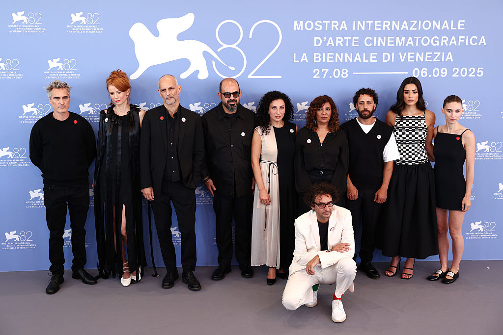 | Image title: VENICE, ITALY - SEPTEMBER 03: (L-R) Joaquin Phoenix, Sarah Rambourg, James Wilson, Amer Hlehel, Clara Khoury, Nadim Cheikhrouha, Kaouther Ben Hania, Motaz Malhees, Saja Kilani and Rooney Mara attends the "The Voice Of Hind Rajab" photocall during the 82nd Venice International Film Festival on September 03, 2025 in Venice, Italy. (Photo by Aldara Zarraoa/Getty Images) |
