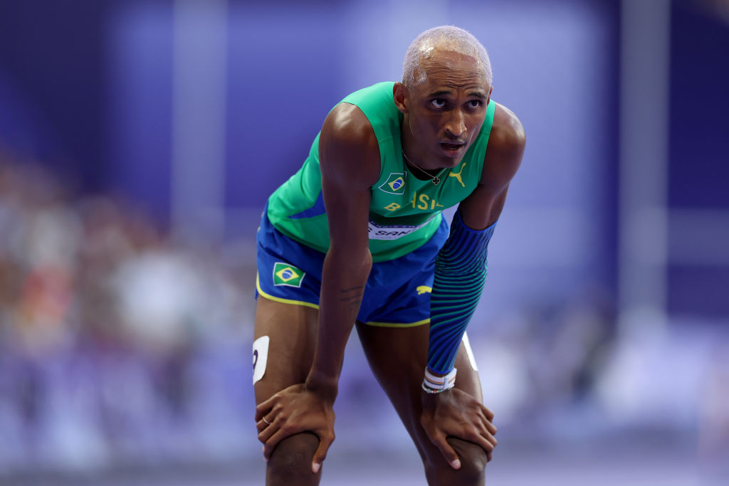 | Image title: PARIS, FRANCE - AUGUST 07: Alison Dos Santos of Team Brazil reacts after competing in the Men's 400m Hurdles Semi-Final on day twelve of the Olympic Games Paris 2024 at Stade de France on August 07, 2024 in Paris, France. (Photo by Patrick Smith/Getty Images) |
