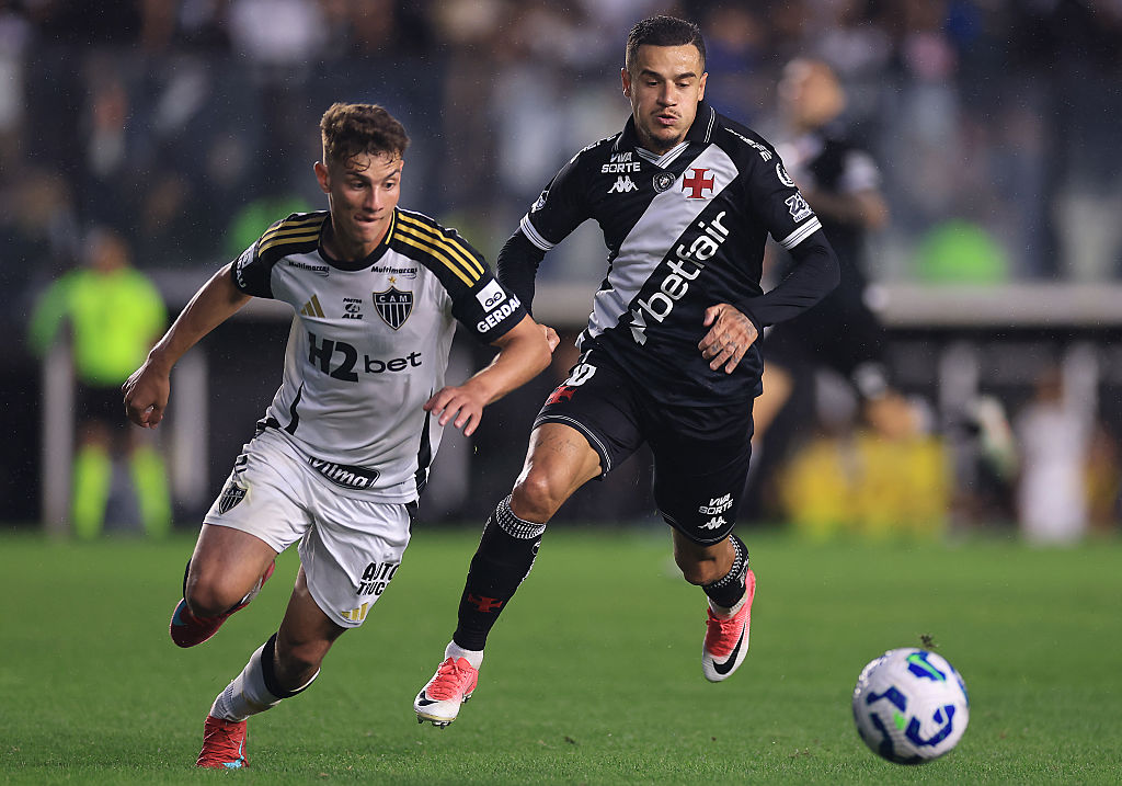 | Image title: RIO DE JANEIRO, BRAZIL - AUGUST 10: Philippe Coutinho of Vasco da Gama competes for the ball with Natanael of Atletico Mineiro during the match between Vasco Da Gama and Atletico Mineiro as part of Brasileirao 2025 at Sao Januario Stadium on August 10, 2025 in Rio de Janeiro, Brazil. (Photo by Buda Mendes/Getty Images) |