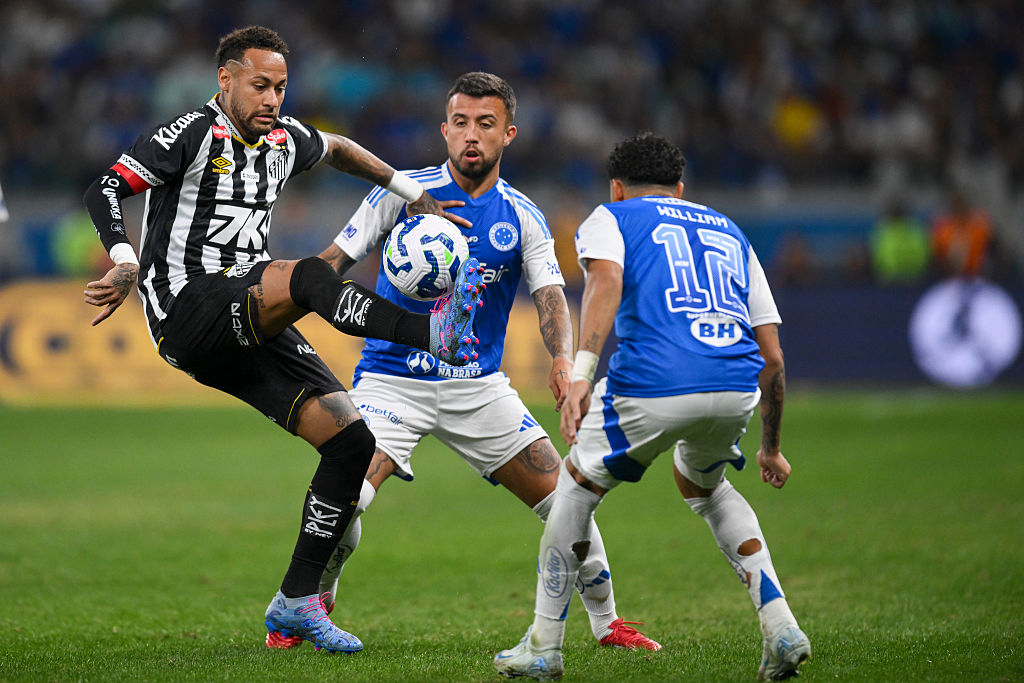 | Image title: BELO HORIZONTE, BRAZIL - August 10: Neymar Jr of Santos controls the ball against Matheus Henrique (C) of Cruzeiro during a match between Cruzeiro and Santos as part of Brasileirao 2025 at Mineirão Stadium on August 10, 2025 in Belo Horizonte, Brazil. (Photo by Pedro Vilela/Getty Images) |