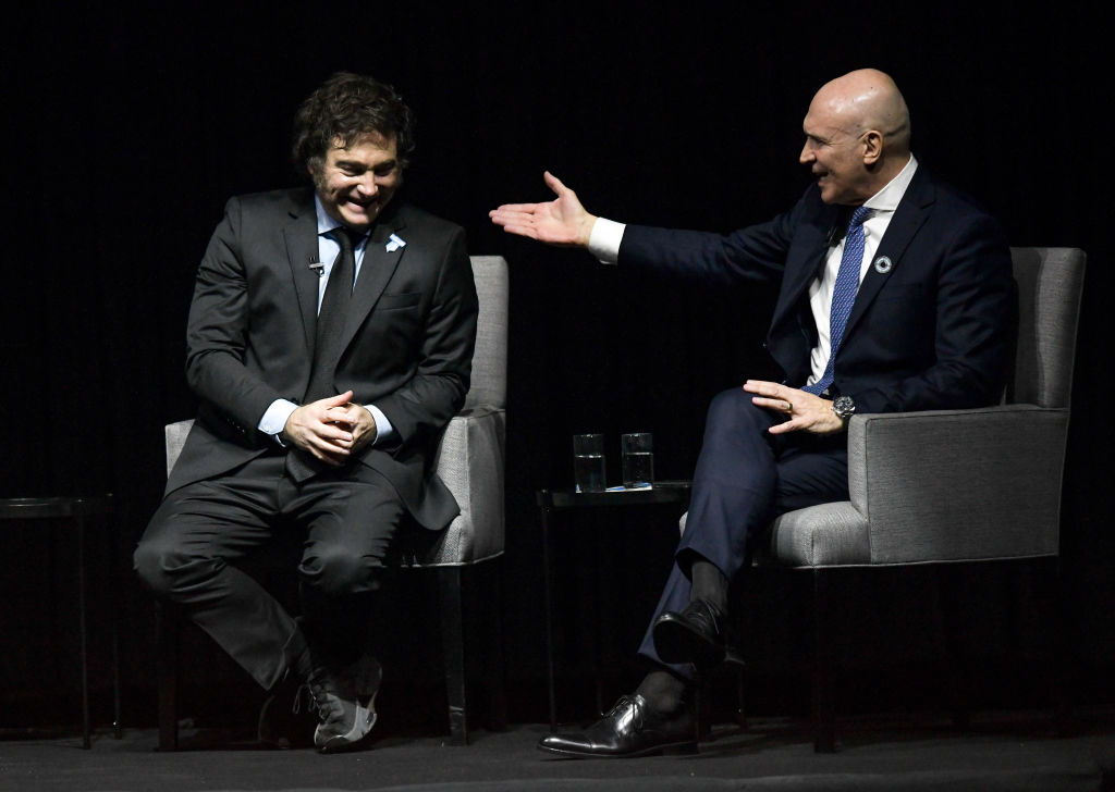 | Image title: BUENOS AIRES, ARGENTINA - MAY 22: (L-R) President of Argentina Javier Milei and deputy of La Libertad Avanza Jose Luis Espert talk during the presentation of Milei's new book 'Capitalismo, Socialismo y La Trampa Neoclasica' (in English: Capitalism, Socialism, and the Neoclassical Trap) at Luna Park on May 22, 2024 in Buenos Aires, Argentina. The presidential Spokesperson Manuel Adorni announced that Milei will perform in a musical show. (Photo by Marcelo Endelli/Getty Images) |