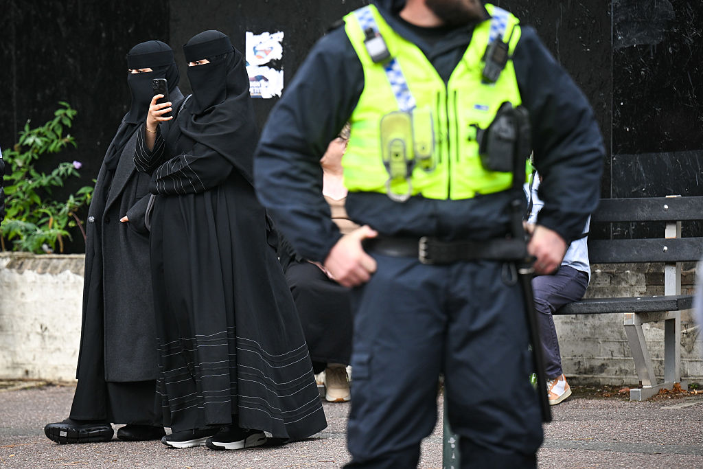 | Image title: BOURNEMOUTH, ENGLAND - SEPTEMBER 20: Anti-migrant protesters march past women wearing Burkas on there way to the Roundhouse Hotel, on September 20, 2025 in Bournemouth, England. Far-right protests outside hotels housing migrants have taken place across the UK over the summer months, often met with counter protests for groups like Stand Up To Racism. This week the first migrants were returned to France through the government's "one in, one out" policy. (Photo by Finnbarr Webster/Getty Images) |