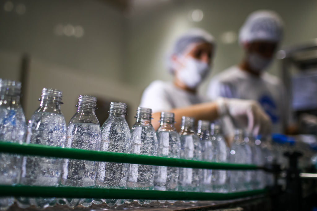 | Image title: VINHEDO, BRAZIL - APRIL 06: Workers in the hand sanitizer bottling process in AGE do Brasil factory on April 6, 2020 in Vinhedo, Brazil. Ambev is producing hand sanitizers using ethanol extracted from its Barra do Pirai Brewery. Ambev is completing the hand sanitizer production with a partner company, AGE do Brasil, which provides the carbopol (to be mixed with the ethanol) and the work force for the process to be completed. In AGE's factory the final product is bottled and labeled; picked up by Ambev's trucks and taken to its distribution center. The hand sanitizers produced by Ambev have been donated to hospitals in Rio de Janeiro and Sao Paulo. Ambev was born in 1999 from the merger between the centenarians 'Cervejaria Brahma' and 'Companhia Antarctica'. Interbrew from Belgium and Ambev merged to create InBev. Belgium-Brazilian InBev acquired Anheuser-Busch from the United States creating the world biggest brewer. (Photo by Buda Mendes/Getty Images) |