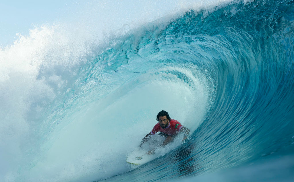 | Image title: TEAHUPO'O, FRENCH POLYNESIA - JULY 28: Filipe Toledo of Brazil rides a barrel in the 8th heat of the men's surfing round 2 on day two of the Olympic Games Paris 2024 on July 28, 2024 in Teahupo'o, French Polynesia. (Photo by Ben Thouard-Pool/Getty Images) |