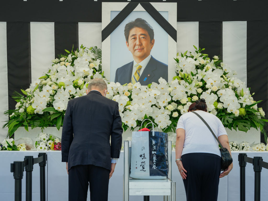 | Image title: TOKYO, JAPAN - SEPTEMBER 27: People leave flowers and pay their respects outside the Nippon Budokan during the state funeral for Japan's former prime minister Shinzo Abe on September 27, 2022 at the Budokan in Tokyo, Japan. Several current and former heads of state visited Japan for the state funeral of Abe, who was assassinated in July while campaigning on a street. (Photo by Nicolas Datiche/Pool/Getty Images) |
