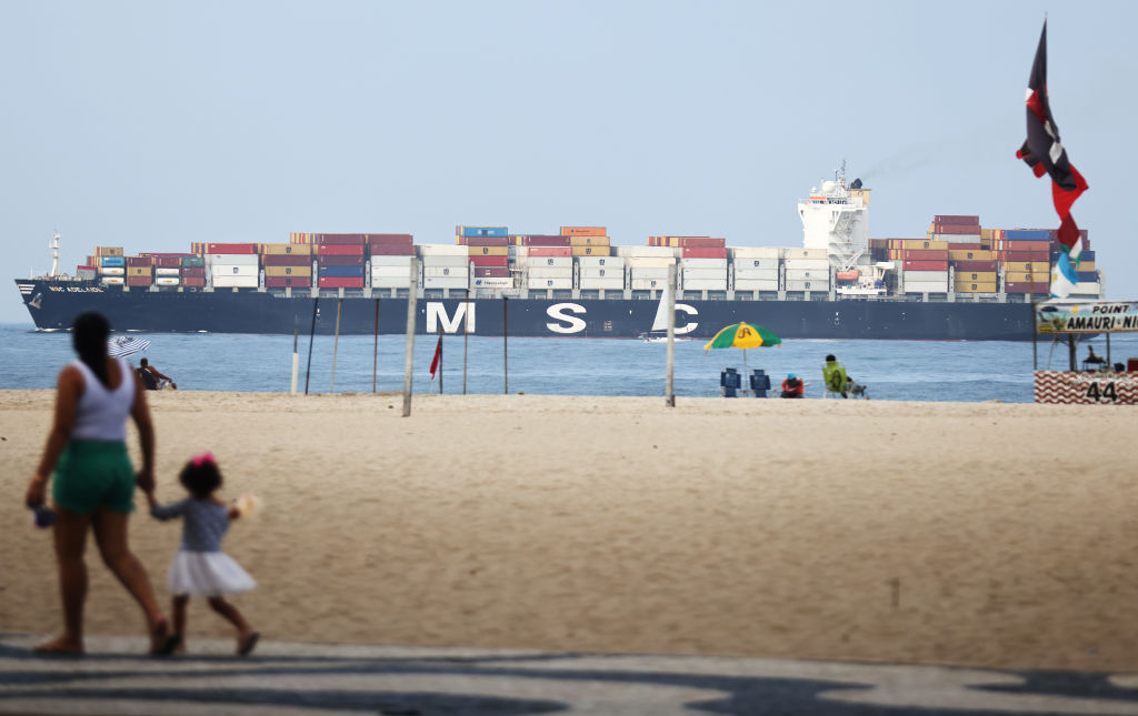 | Image title: RIO DE JANEIRO, BRAZIL - MAY 27: A container ship passes near Copacabana Beach on an overcast morning on May 27, 2021 in Rio de Janeiro, Brazil. While Rio's beaches see less visitors in May as the Brazilian winter approaches, tourism has been heavily impacted by the pandemic. Brazil lost $48 billion in revenue from the tourism sector in 2020 due to the COVID-19 pandemic, according to the National Confederation of Trade of Goods, Services and Tourism (CNC). Health experts are warning that Brazil should brace for a new surge of COVID-19 amid a slow vaccine rollout and relaxed restrictions. More than 450,000 people have been killed in Brazil by COVID-19, second only to the U.S. (Photo by Mario Tama/Getty Images) |