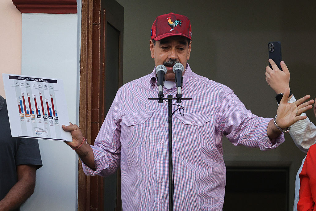 | Image title: CARACAS, VENEZUELA - JULY 28: President Nicolás Maduro of Venezuela displays a chart with data while he speaks during the commemoration of the 71st Anniversary of the birth of late former President of Venezuela Hugo Chávez on July 28, 2025 in Caracas, Venezuela. (Photo by Jesus Vargas/Getty Images) |