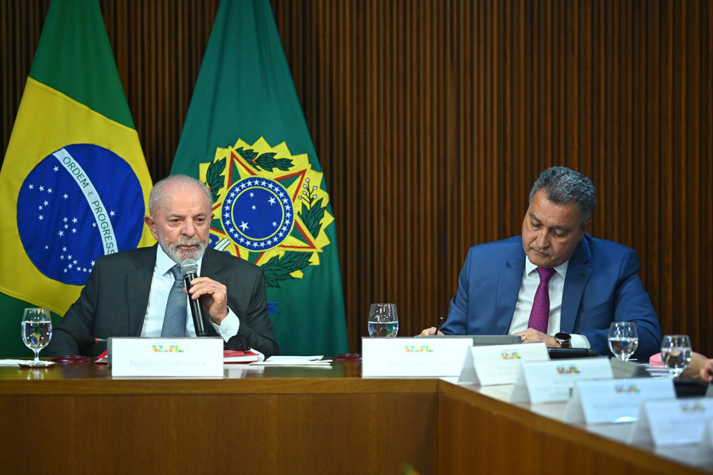| Image title: BRASILIA, BRAZIL - OCTOBER 31: (L-R) President of Brazil Luiz Inácio Lula da Silva speaks next to Minister of the Civil House Rui Costa during a meeting with governors of the brazilian states at Palacio Do Planalto on October 31, 2024 in Brasilia, Brazil. (Photo by Ton Molina/Getty Images) |