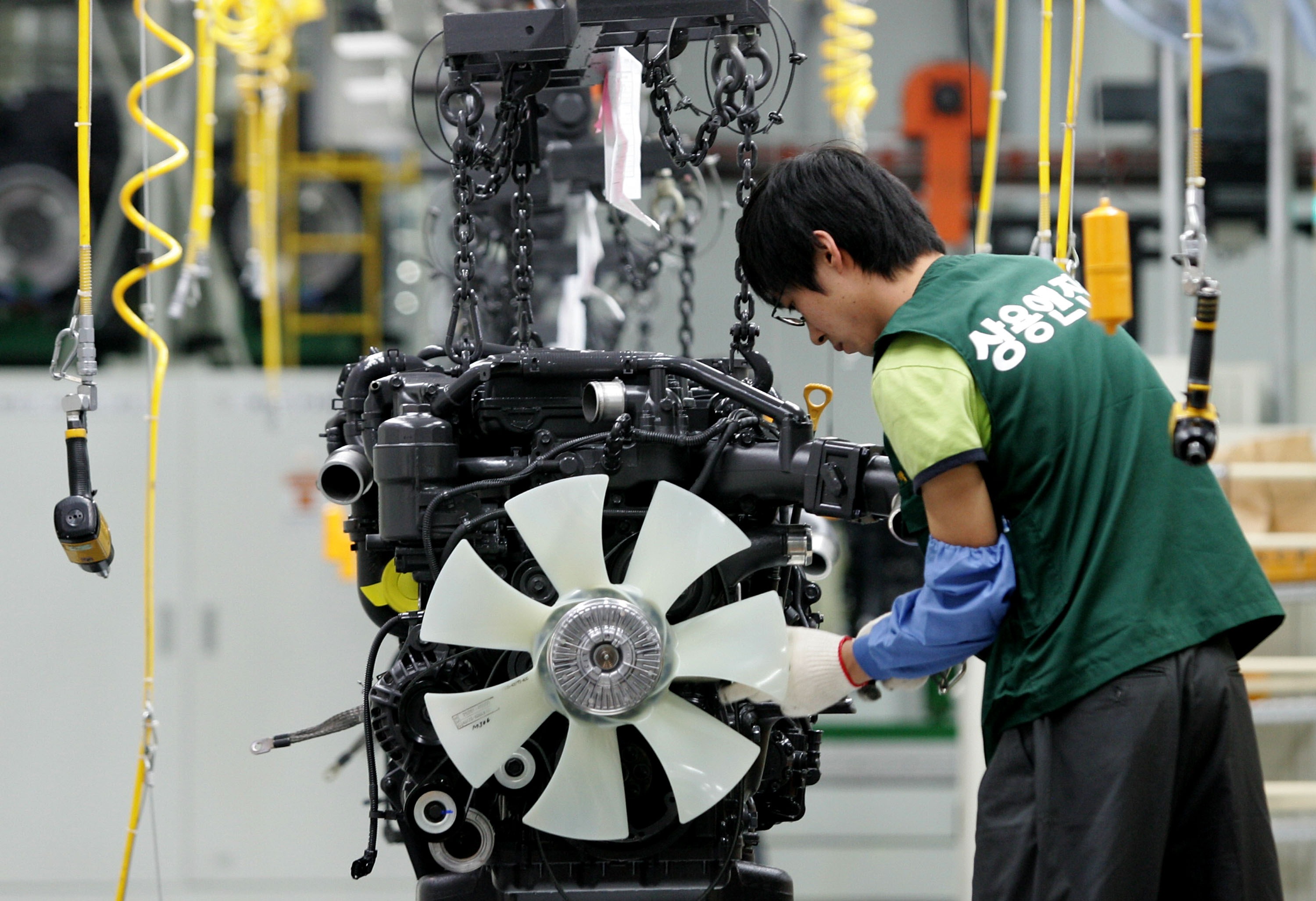 | Image title: JEONJU, SOUTH KOREA - OCTOBER 17: An employee works on an engine assembly line for a Hyundai trucks and bus at the JeonJu plant on October 17, 2007 in JeonJu, South Korea. Hyundai Motor Co. has worked hard to overcome its early image of poor quality, but is increasingly lagging behind its competitors as rivals develop cleaner, more fuel-efficient cars. (Photo by Chung Sung-Jun/Getty Images) |
