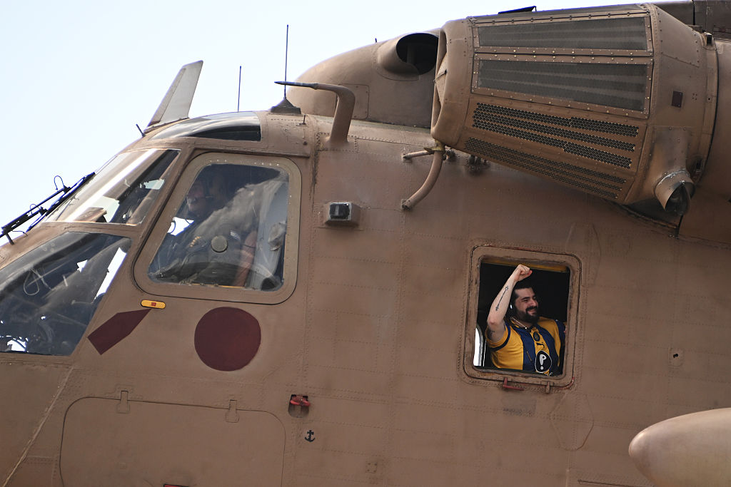 | Image title: RAMAT GAN, ISRAEL - OCTOBER 13: Gaza hostage Ziv Berman celebrates from a helicopter as he arrives at Chaim Sheba Medical Center at Tel HaShomer on October 13, 2025 in Ramat Gan, Israel. The ceasefire deal between Israel and Hamas has brought an end to the two years of war that followed the attacks of Oct. 7, 2023. A condition of the deal was the immediate return of 48 hostages held in Gaza, around 20 of whom were believed to be alive. (Photo by Alexi J. Rosenfeld/Getty Images) |