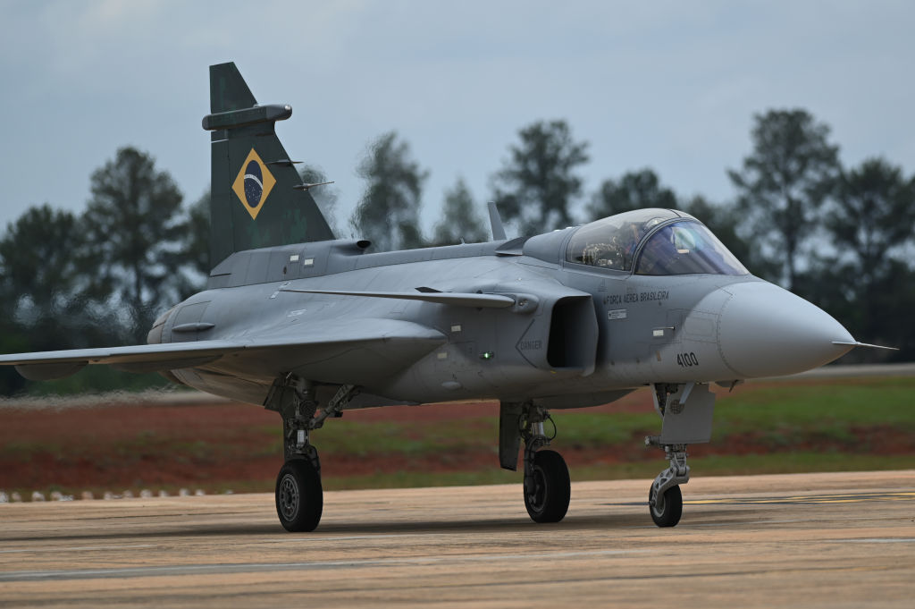 | Image title: BRASILIA, BRAZIL - OCTOBER 22: The new Brazilian Air Force aircraft, F-39E Gripen, parks on the runway during the Aviator and Brazilian Air Force Day ceremony amidst the Coronavirus (COVID - 19) pandemic at Aeronautics Air Base on October 22, 2020 in Brasilia. Brazil has over 5.323,000 confirmed positive cases of Coronavirus and has over 155,900 deaths. (Photo by Andre Borges/Getty Images) |