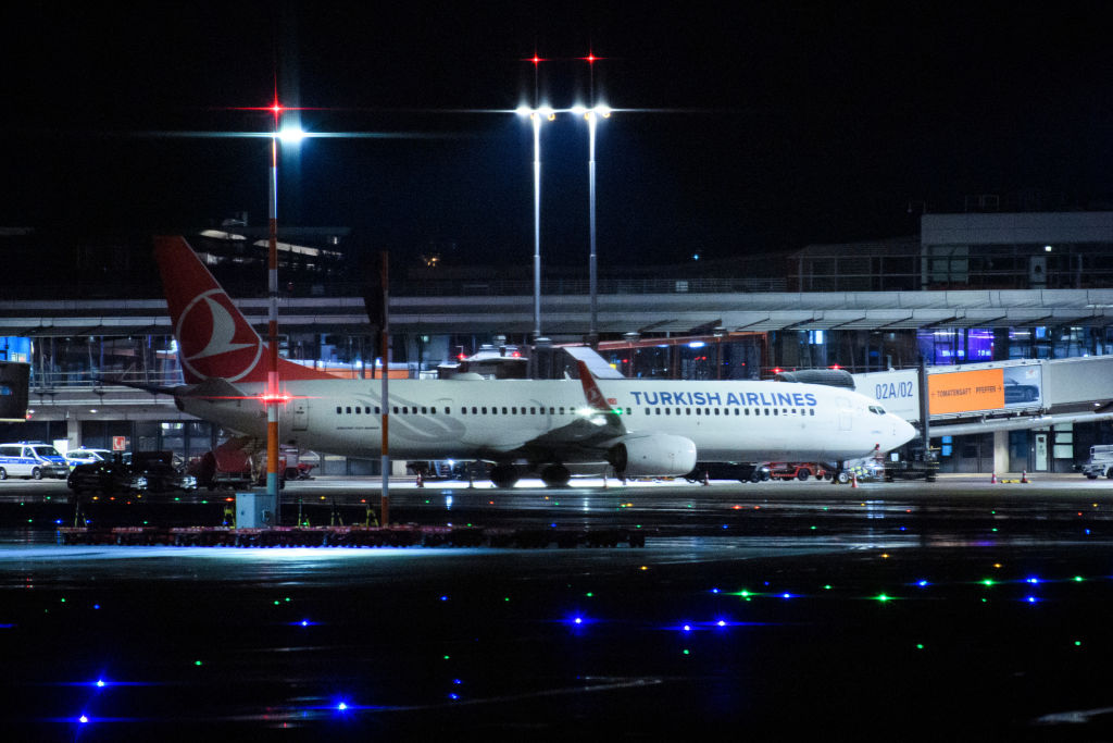 | Image title: HAMBURG, GERMANY - NOVEMBER 05: A Turkish Airlines airplane is grounded and surrounded by police vehicles on November 5, 2023 in Hamburg, Germany. According to media reports, a man armed with a gun drove a car through a perimeter gate onto the tarmac, where he attempted to set several fires. He reportedly also has two children in the car with him and is now in a standoff with police. All flights from the airport have been cancelled and approaching flights diverted. (Photo by Gregor Fischer/Getty Images) |