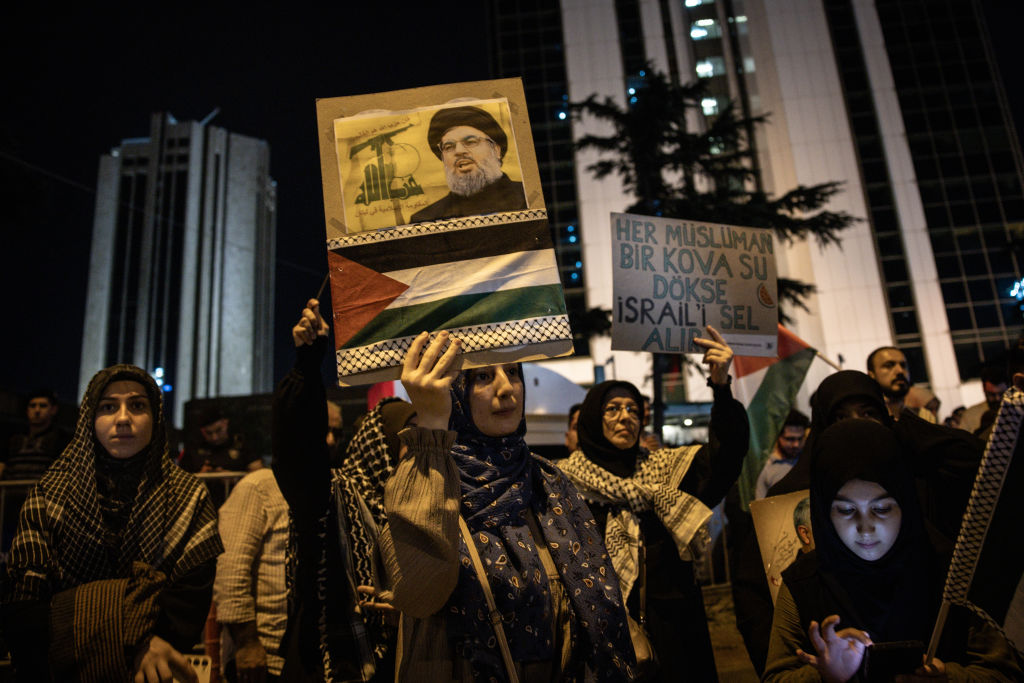 | Image title: ISTANBUL, TURKEY - SEPTEMBER 28: A woman holds a poster of Hezbollah leader Sayyed Hassan Nasrallah in front of the Israeli Consulate during a solidarity march and protest for Palestine and Lebanon outside the Israeli Consulate on September 28, 2024 in Istanbul, Turkey. The protests come as the world reacts to the announcement by Israel that it had killed Hezbollah leader Sayyed Hassan Nasrallah in an airstrike yesterday. (Photo by Chris McGrath/Getty Images) |