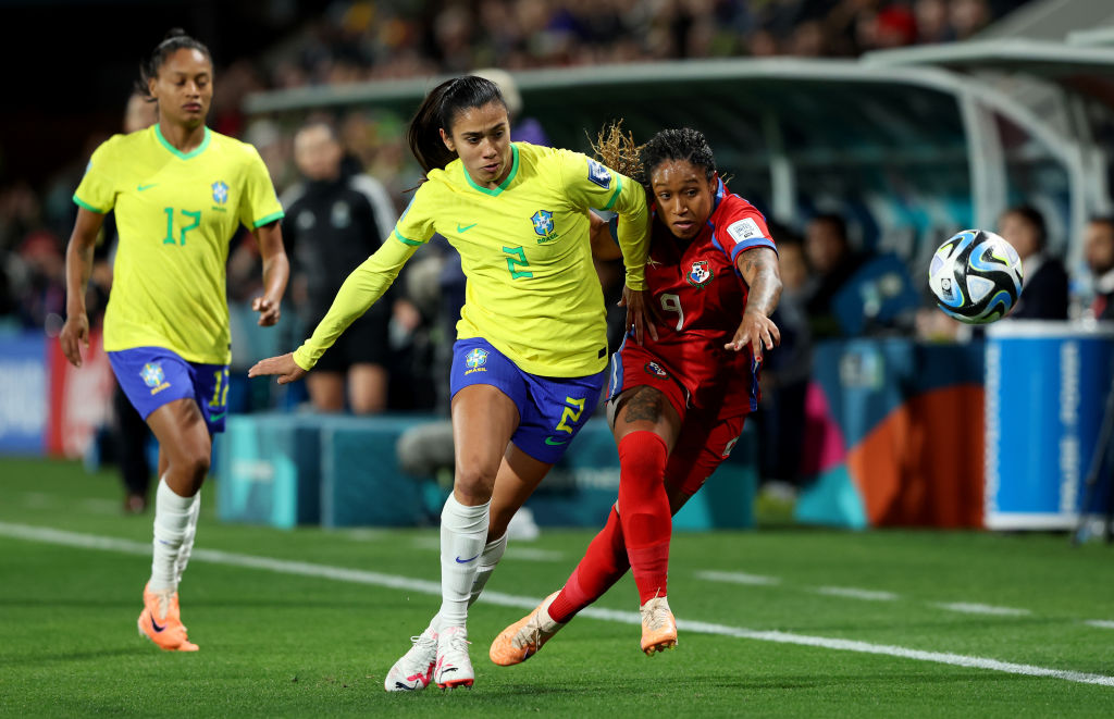 | Image title: ADELAIDE, AUSTRALIA - JULY 24: Karla Riley of Panama and Antonia of Brazil compete for the ball during the FIFA Women's World Cup Australia & New Zealand 2023 Group F match between Brazil and Panama at Hindmarsh Stadium on July 24, 2023 in Adelaide, Australia. (Photo by Sarah Reed/Getty Images) |