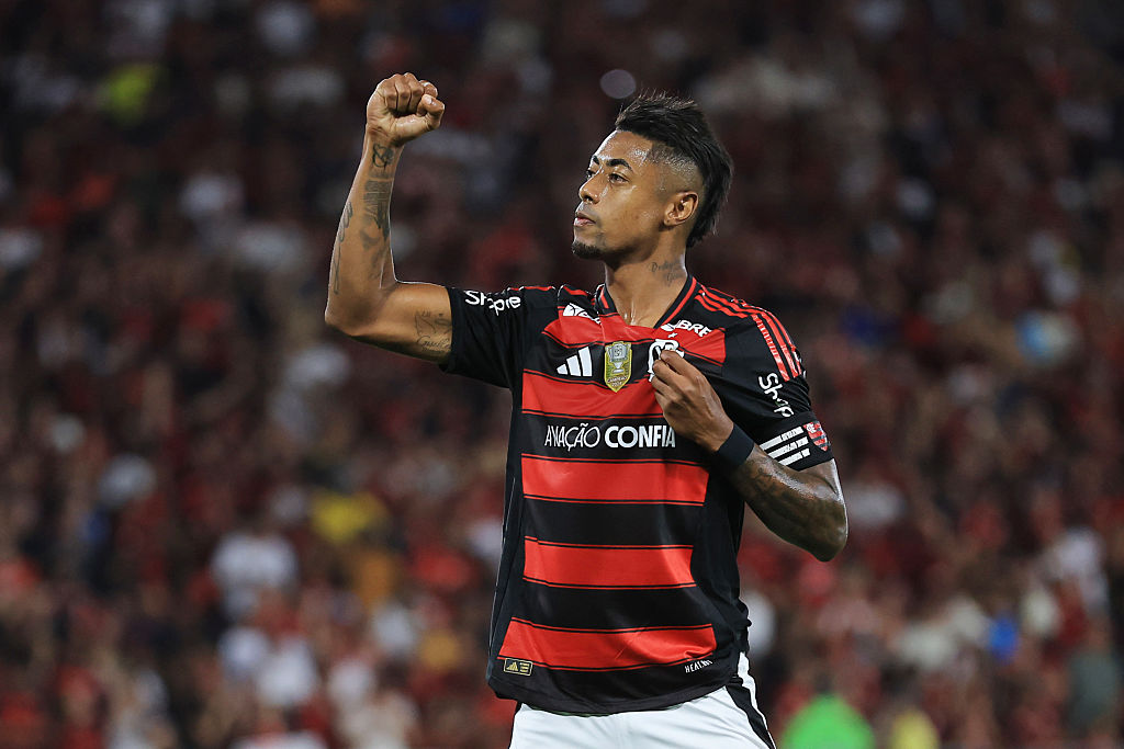 | Image title: RIO DE JANEIRO, BRAZIL - AUGUST 25: Bruno Henrique of Flamengo celebrates after scoring the team's eight goal during the Brasileirao 2025 match between Flamengo and Vitoria at Maracana Stadium on August 25, 2025 in Rio de Janeiro, Brazil. (Photo by Buda Mendes/Getty Images) |