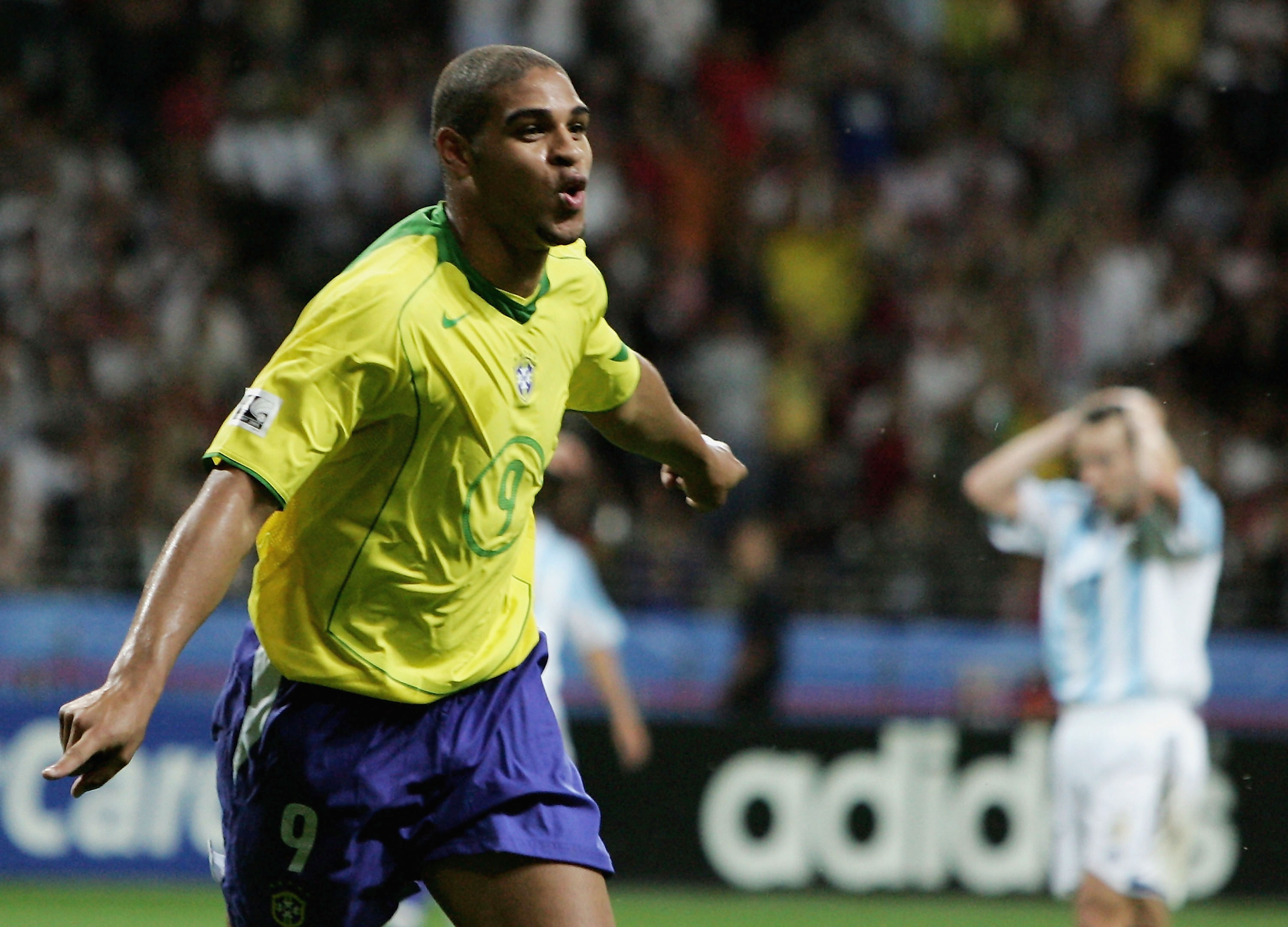 | Image title: FRANKFURT, GERMANY - JUNE 29: Adriano of Brazil celebrates scoring his team's fourth goal during the FIFA 2005 Confederations Cup Final between Brazil and Argentina at the Waldstadion on June 29, 2005, in Frankfurt, Germany. (Photo by Ben Radford/Getty Images) |
