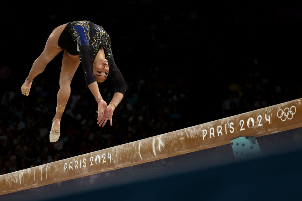 | Image title: PARIS, FRANCE - JULY 28: Julia Soares of Team Brazil competes on the balance beam during the Artistic Gymnastics Women's Qualification on day two of the Olympic Games Paris 2024 at Bercy Arena on July 28, 2024 in Paris, France. (Photo by Naomi Baker/Getty Images) |