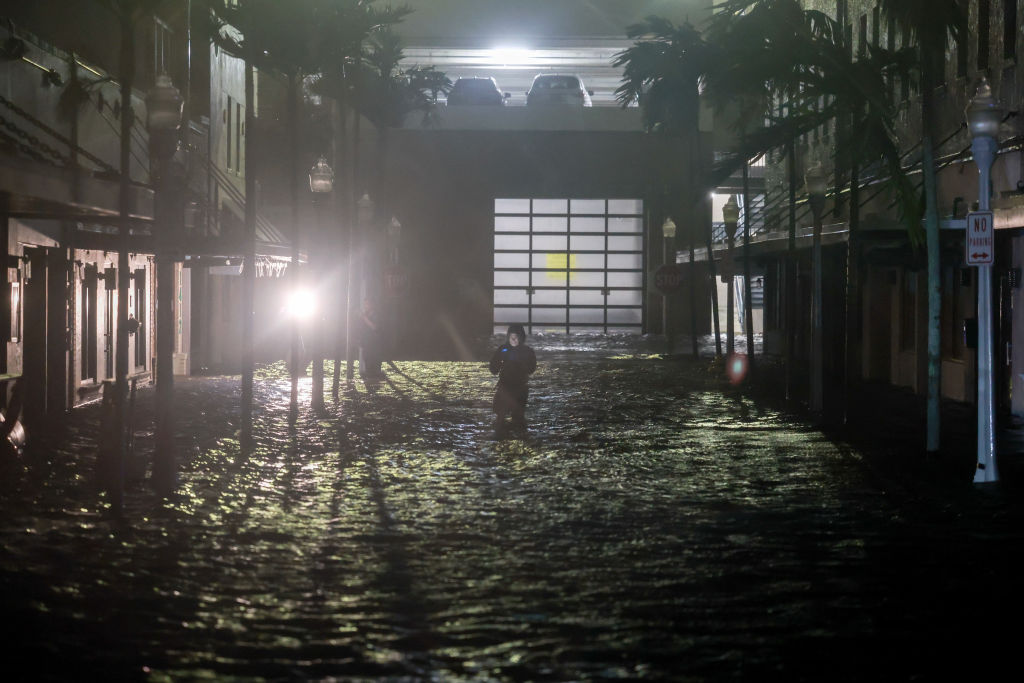 | Image title: FORT MYERS BEACH, FLORIDA - OCTOBER 09: A person walks through surge waters after Hurricane Milton made landfall in the Sarasota area on October 09, 2024, in Fort Myers, Florida. Milton, coming on the heels of the destructive Helene, hit as a category 3 storm with winds of over 100 mph, though veering south of the projected direct hit on Tampa. Instead, the storm, which earlier had reportedly spawned tornadoes, landed about 70 miles south of Tampa near Siesta Key, a strip of white-sand beaches that's home to 5,500 people, according to published reports.. (Photo by Joe Raedle/Getty Images) |