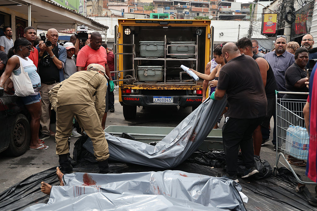| Image title: RIO DE JANEIRO, BRAZIL - OCTOBER 29: (EDITOR'S NOTE: Image depicts death.) Civil defense personnel carry bodies found in the woods of the Penha neighborhood a day after a massive anti-gang police operation took place at the Complexo da Penha and Alemao favelas on October 29, 2025 in Rio de Janeiro, Brazil. The 'Operação Contenção' is considered the biggest of its kind in Rio de Janeiro, with more than 120 people reported dead, including 4 police officers among those. The operation targeted the Comando Vermelho, one of the biggest criminal gangs in the city. (Photo by Wagner Meier/Getty Images) |