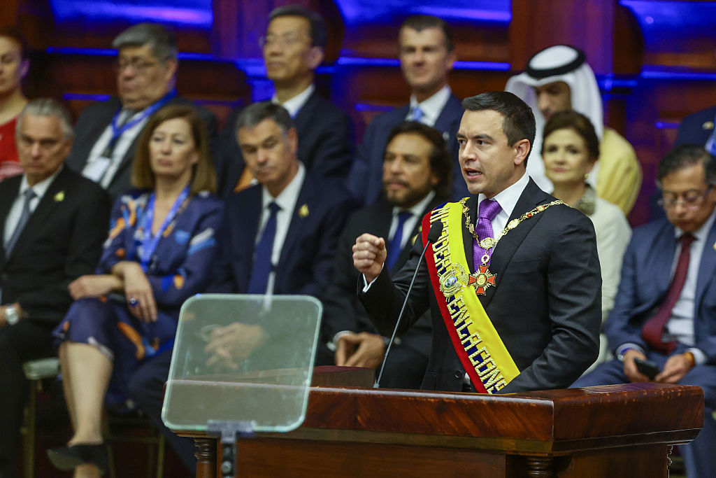 | Image title: QUITO, ECUADOR - MAY 24: President of Ecuador Daniel Noboa gives a speech during the presidential inauguration at National Assembly building on May 24, 2025 in Quito, Ecuador. Noboa inaugurates his first complete 4-year term after serving 17 months in office due to President Guillermo Lasso "cross death" call to dissolve parliament and early elections. (Photo by Franklin Jacome/Getty Images) |