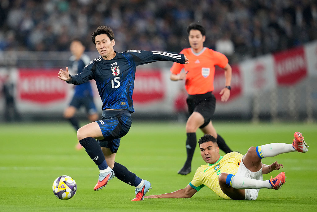 | Image title: CHOFU, JAPAN - OCTOBER 14: Daichi Kamada of Japan (L) goes past Casemiro of Brazil (R) during the international friendly match between Japan and Brazil at Tokyo Stadium on October 14, 2025 in Chofu, Tokyo, Japan. (Photo by Toru Hanai/Getty Images) |